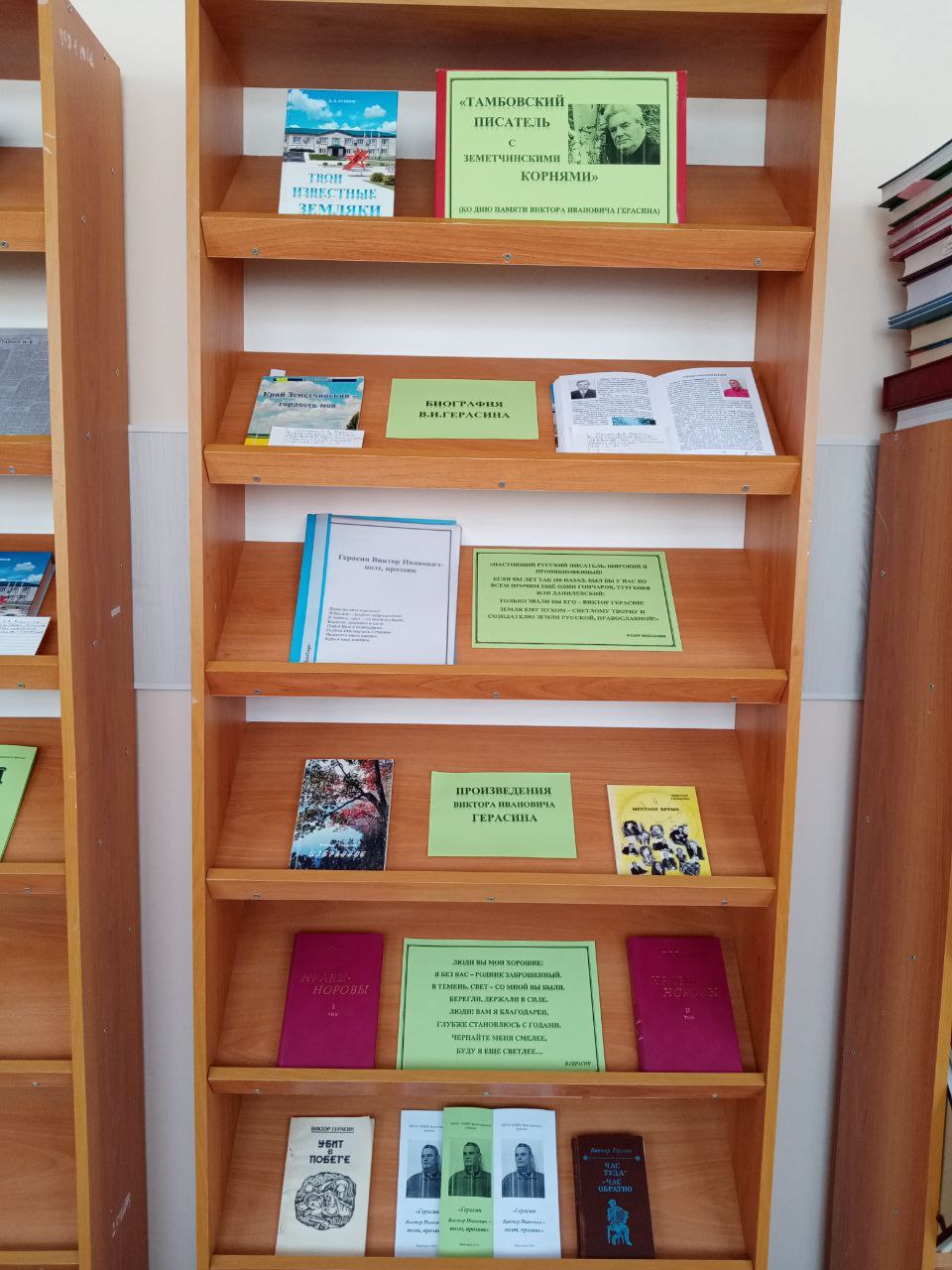 Виктор Иванович Герасин, наш известный писатель, родился 24 сентября 1939 года в рабочем посёлке Земетчино Пензенской области, но вся его сознательная жизнь связана с Тамбовским краем. Писатель скончался 5 января 2016 года в Котовске. Ко дню памяти В.И. Герасина в Центральной библиотеке оформлена книжная выставка «Тамбовский писатель с Земетчинскими корнями», состоящая из двух разделов. Первый знакомит с биографией В.И. Герасина, а второй – с творчеством писателя.