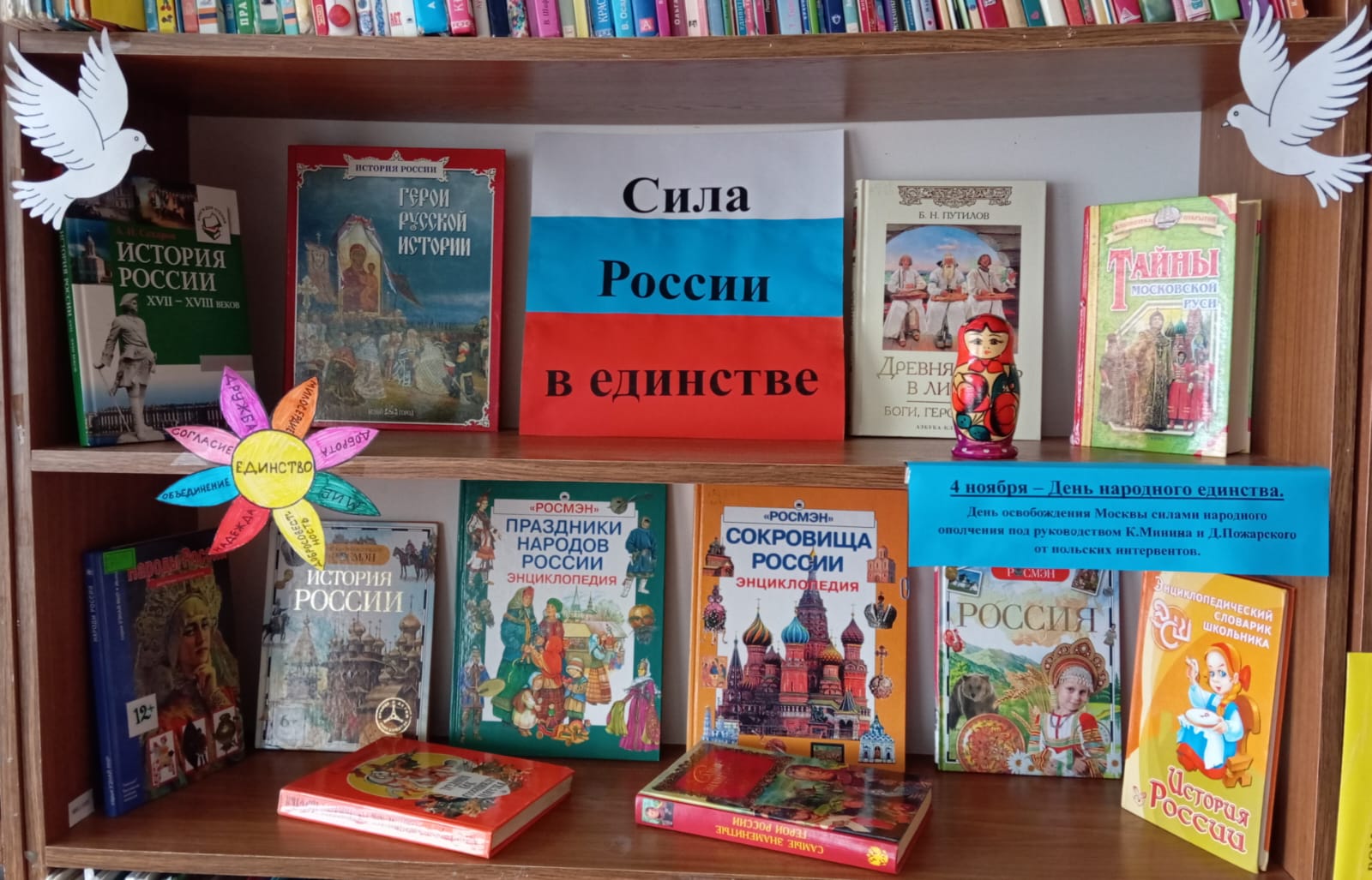 4 ноября в России отмечается День народного единства — государственный праздник, который символизирует сплоченность, взаимопомощь и силу народа. В преддверии праздника в Детской библиотеке оформлена книжно-иллюстративная выставка «Сила России в единстве». Книги, представленные на выставке, являются проводниками в прошлое и настоящее России, рассказывают о её истории, знакомят с традициями и обычаями многочисленных народов, населяющих нашу страну.