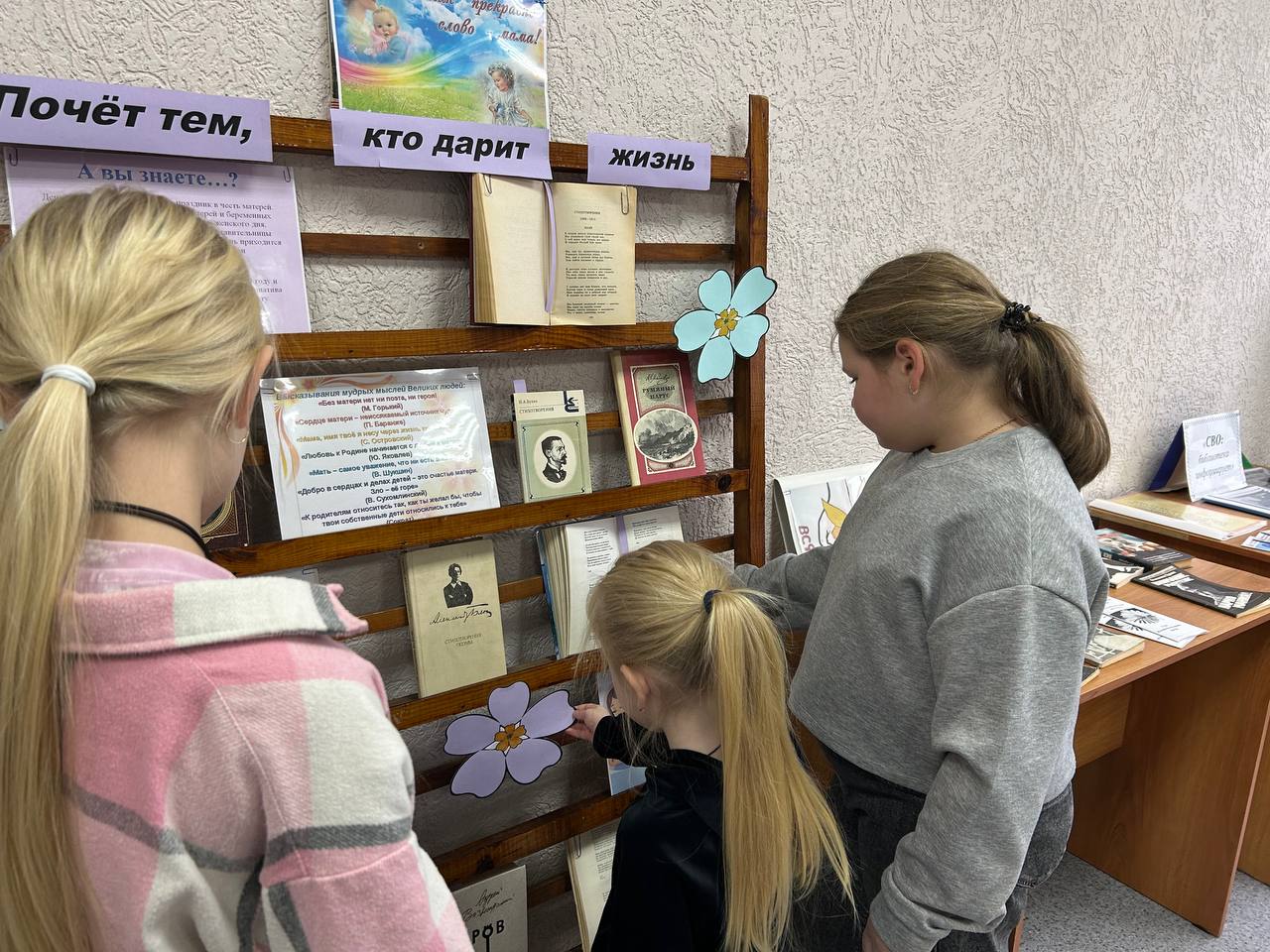 К Дню матери, который ежегодно отмечается в России в последнее воскресенье ноября, в Пролетарской сельской библиотеке подготовлена выставка-праздник, которая знакомит посетителей с информацией о празднике, с мудрыми высказываниями великих людей о важной роли матерей в жизни каждого человека. Здесь читатели встретят книги поэтов разных периодов русской литературы с лирическими произведениями, посвящёнными самому дорогому человеку — маме.