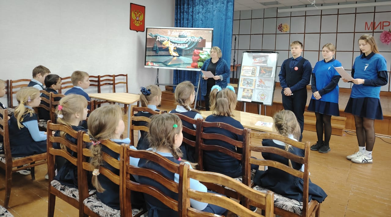 Для детей начальных классов школы п. Пашково прошел час памяти «Герои уходят в бессмертие», посвященный Дню неизвестного солдата. Мероприятие организовано библиотекарем Пашковской сельской библиотеки Ляпичевой Ольгой Петровной, советником директора школы по воспитанию Сурковой Тамарой Рональдовной и активистами движения «Первых».
