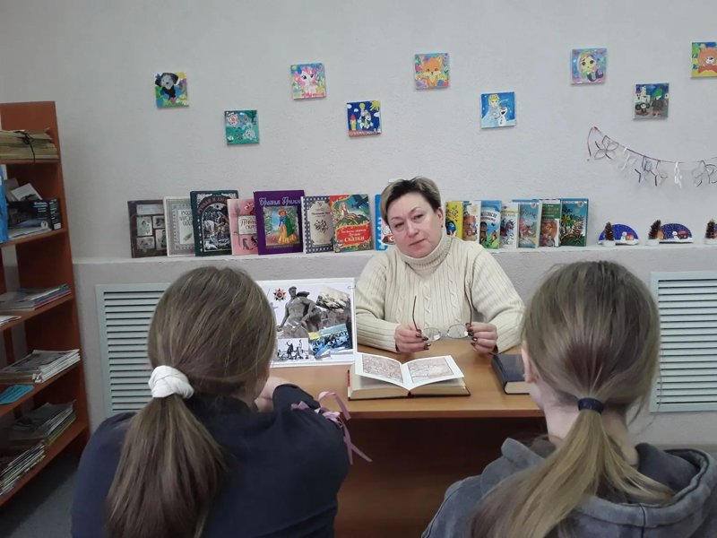Библиотекарь рассказала ребятам о героической защите города, о том, как проходила битва, о боях на Мамаевом кургане, о «доме Павлова», ставшего символом стойкости и мужества,о масштабах и значении Сталинградской битвы, а также узнали о памятниках и мемориалах установленных в ознаменование подвига героев битвы.