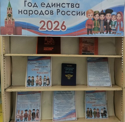 С целью укрепления национального единства, мира и согласия между народами нашей страны, 2026 год объявлен Годом единства народов России. В библиотеке села Большая Ижмора оформлена выставка, приуроченная к празднованию этого события.