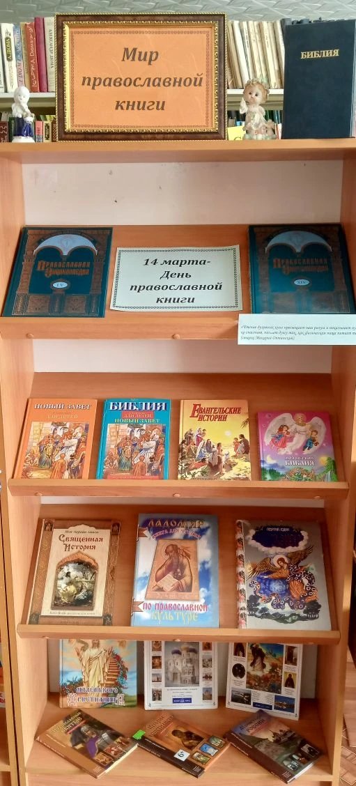 К этому событию в Детской библиотеке организована книжная выставка «Мир православной книги», где представлены издания, знакомящие с историей православия, жизнеописаниями русских святых и жизнью подвижников, а также произведения, наставляющие читателя на путь добра, милосердия, сострадания и любви к Богу и ближним.